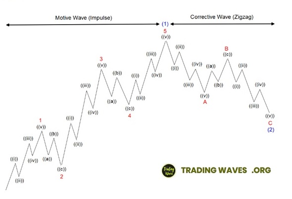 ((iv)), and ((v)). Waves 2 and 4 are corrective waves and they are subdivided
