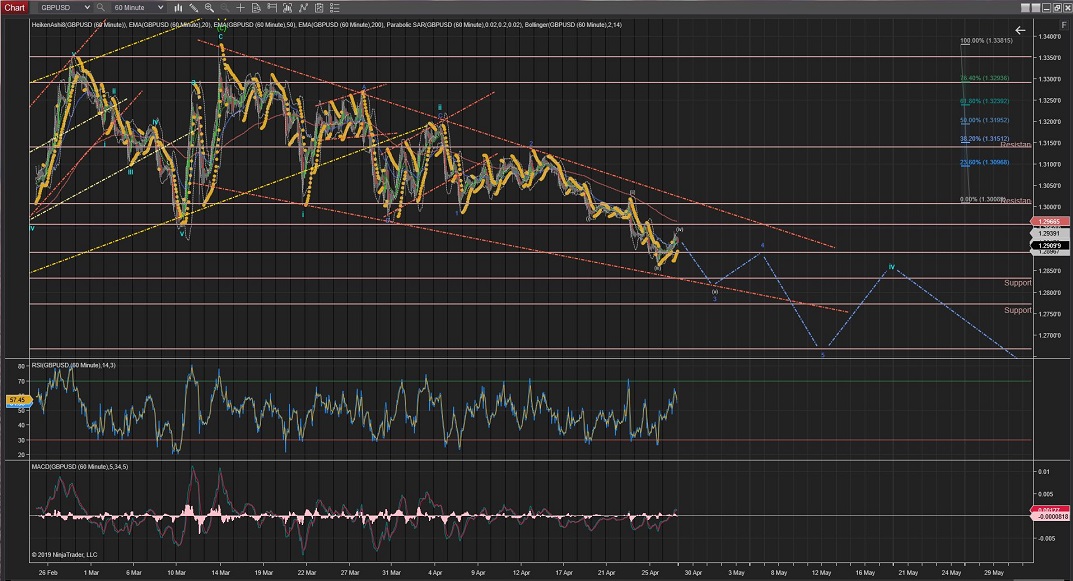 Next we should see the impulsive waves to continue to the downside for Wave (v) completion and the possibility and the next support level lies at 1.1060, where a loong-term trend line lies (best shown on the 4Hour and Daily charts).
