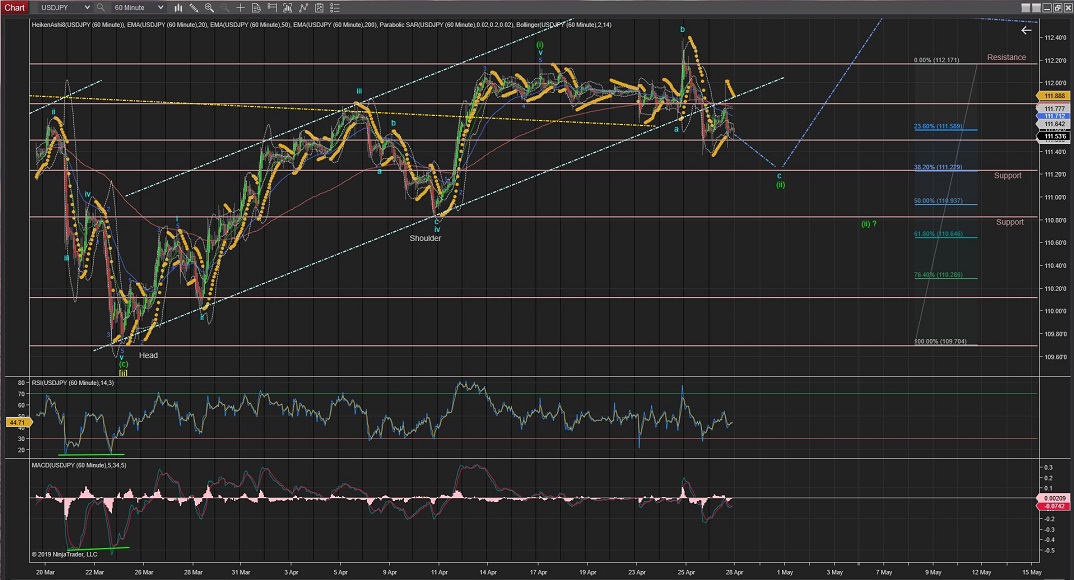 Still not out of the woods yet, so further moves lower than this neckline would trigger the alternative count for an extended Wave [ii] going towards the %76 levels of support, although it is still possible an extended Wave [v] or even a further extended Wave 5, with not much resistance levels to stop the move down (best seen in the 4Hour and Daily charts) .