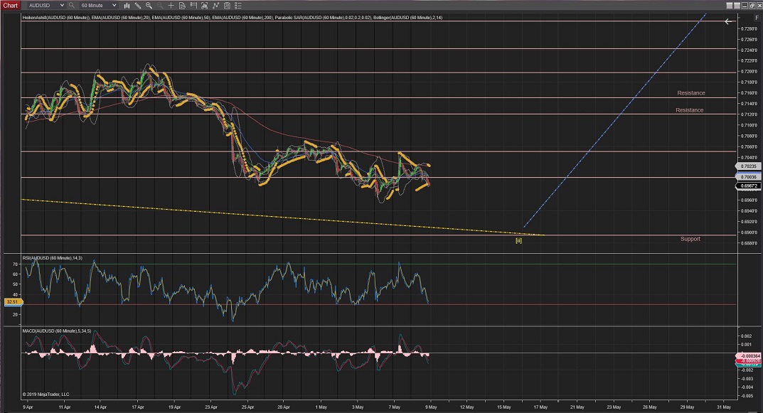 In the hourly chart, the best that I can make for a Wave (i) and Wave (ii) correction is at the point of crossing the upper trend (blue).