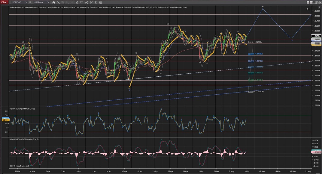 USDCAD since Wave (iv) has been completed, Wave (v) has developed an internal wave up and a correction so, as per current count, I would expect the price to carry on raising and break through the next level of resistance, likely towards the 1.3560 areas of further resistance.
