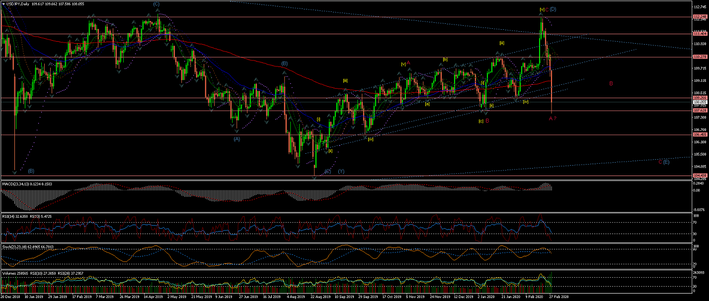 Daily Chart is showing the initials Wave (i) and Wave (ii) of Wave [i](yellow) (of Wave 3(red)) most likely completed.