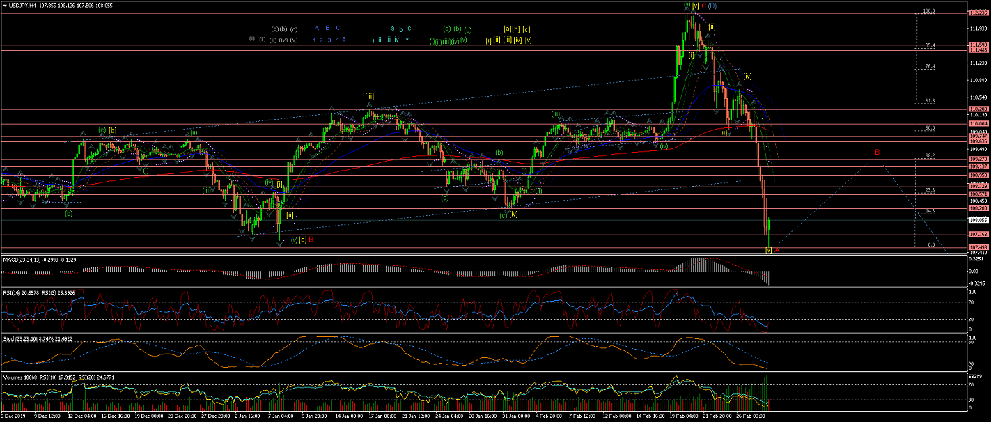 And a doji candle that, adding to oversold indicators in the 4Hr and 1Hr Charts, suggest a possible start of Wave B(red)