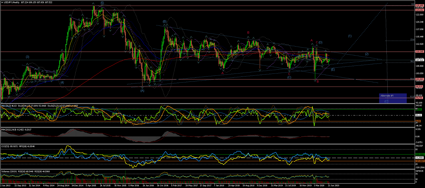 Daily Chart is showing the current Wave (E) now on the way towards the lower trendline (blue)