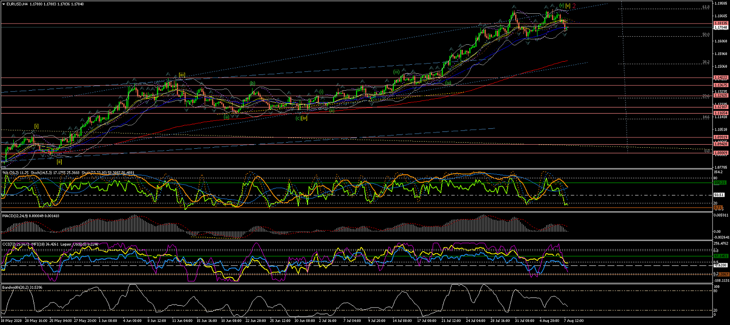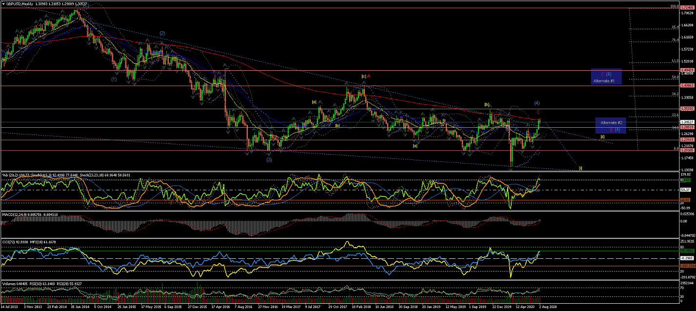 Weekly chart shows the updated count for an extended Wave (4) correction hitting the 200EMA to