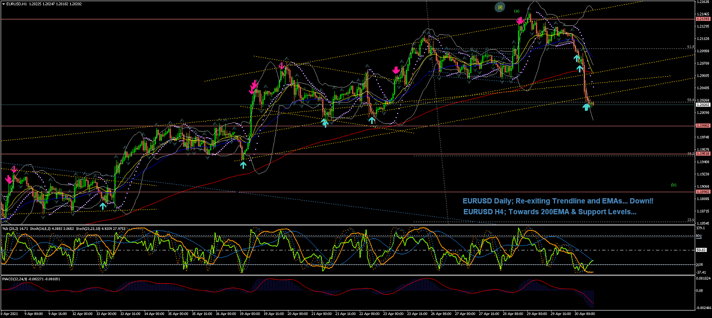 And now the price as it is crossing the 200EMA and lower Trendline for the potential of a new long-term Trend to the downside...
