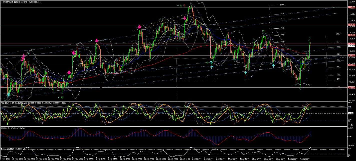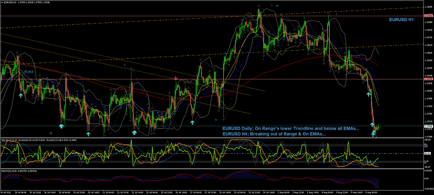 4Hour Chart is showing the price breakout of the Ascending Range (blue) and EMAs to the downside suggests the internal waves of Wave [iii]...