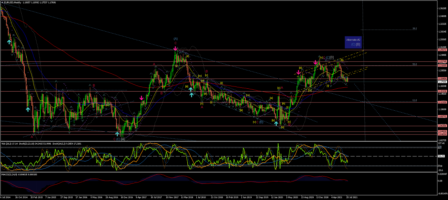 Weekly chart shows an extended Wave (4) correction crossing the EMAs in a rather struggling way...