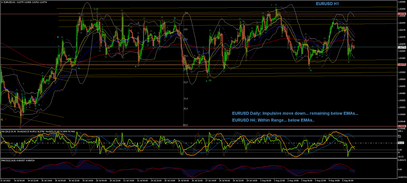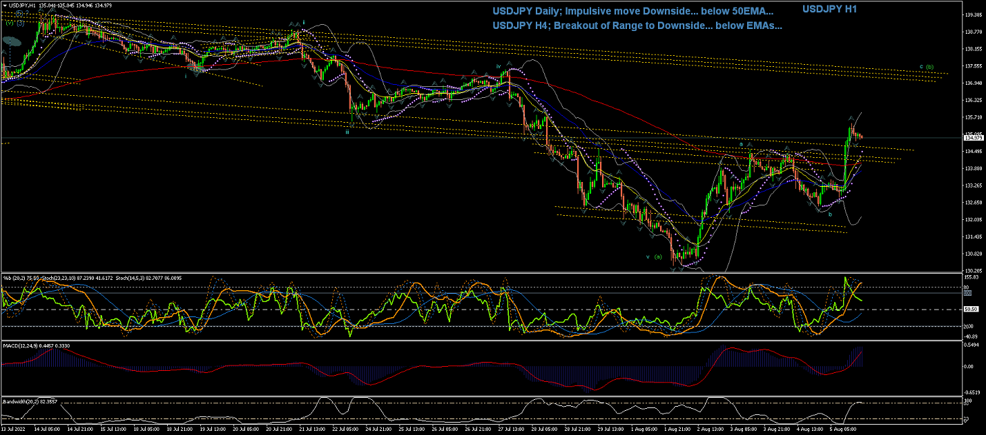 4Hour Chart shows impulsive moves to the downside... After what appears to be Wave a of Wave (iv) completed within a Range... Now, watch out for completion of Wave (v) of Wave 3(blue), as the current count suggests...