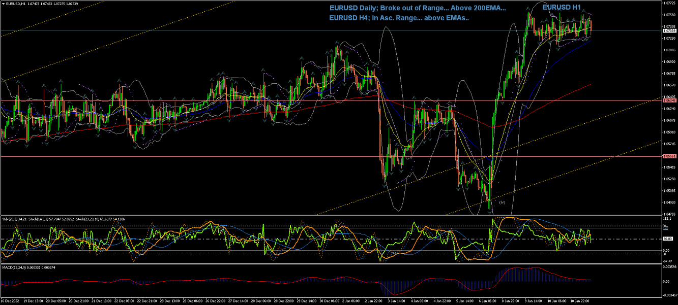4Hour Chart shows the price raising above the EMAs in a series of Waves 1 and 2... Looking to breakout of the current Ranges; which can bring the price much higher...