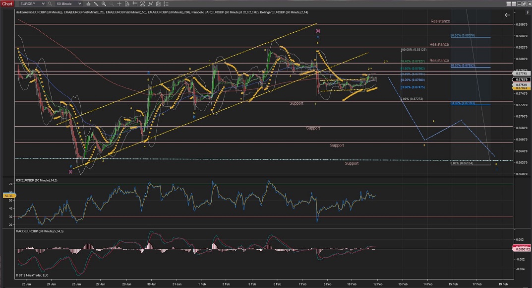 EURGBP is still stuck on Wave 2 (yellow) which could potentially end at the %76 fib retracement level, although once it is completed, seen previous impulsive moves to the down side, Wave 3 should show them too which should cross the initial Support levels towards the lower long-term trend line.