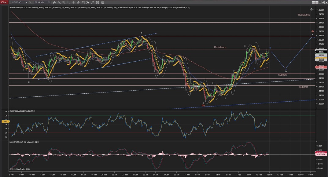 Wave iv seem to have already done the first of its corrective waves and might raise slightly before it drops again towards support (1.3200 area) for completion, although there is a real possibility that Wave iv has come to an end and Wave v might have already started.
