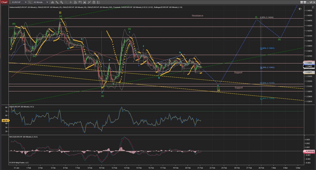 As per current count, if the trend changes to show impulsive waves to the downside after hitting key Fib retracements (i.e. %76) Wave (iii) would then be underway.