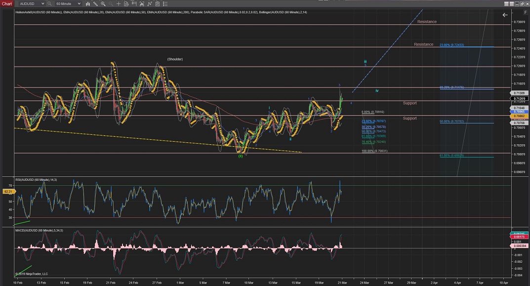 AUDUSD 4Hour Chart is showing the price raising from the neckline of a clear Head & Shoulders pattern which is suggesting Wave (iii) could be finally making its way up.