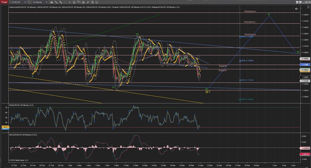 As per current count, the price should turn around upon completion of Wave (e) when it hits the triangle lower trend line at the 1.1300 area (as shown in the 60Min and 4Hour Charts.