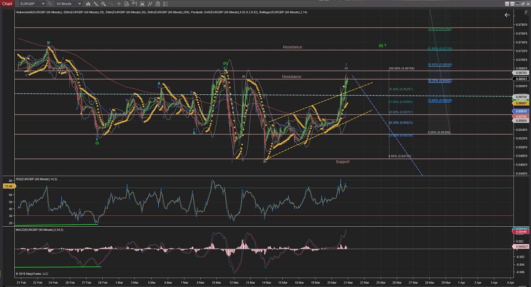 Any move up further than the highest of Wave (ii) would trigger the alternate count for an extended Wave (ii) going towards the %62Fib retracement (at the 0.8720 area).