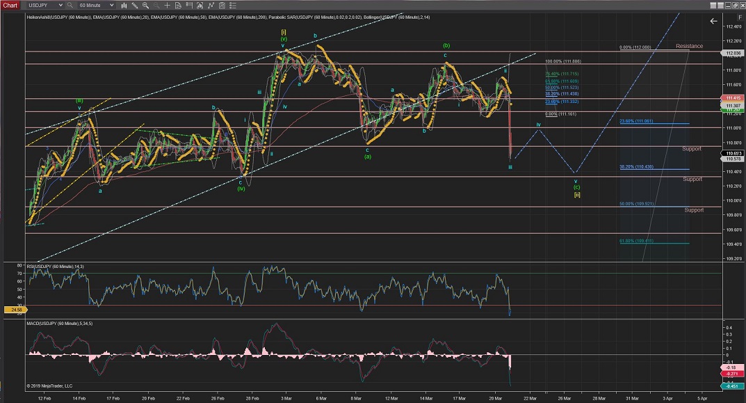 I would expect a corrective Wave iv to raise soon (possibly towards the 111.00 area) and then Wave v to drop lower again to support area towards lower support levels (%38Fib at 110.40 or %50Fib at the 110.00 levels).