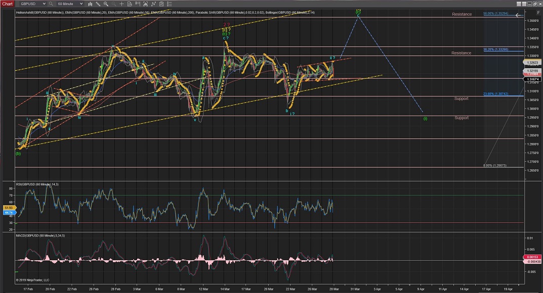 Although most indications are pointing that the price still will be heading down towards the lower long-term trend line again to complete Wave [ii] at the %62 Fib retracement (best shown in the 4Hour Chart).
