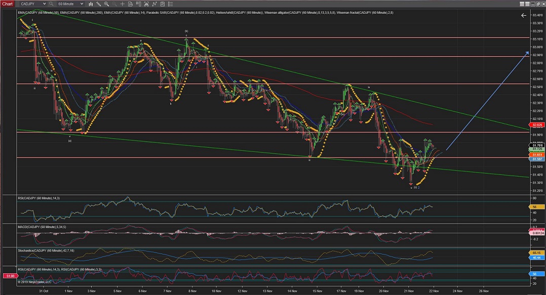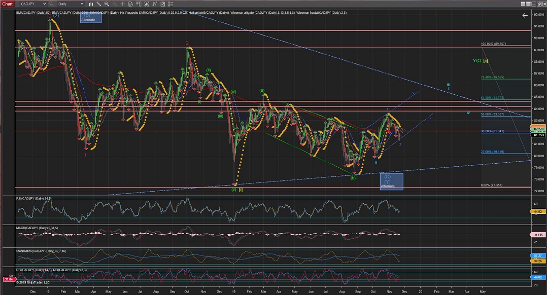 CADJPY 60Min Chart is showing the innings of this Wave 2(blue) correction. And, although there could be different interpretations (i.e. a triangule ABCDE) I am inclined to use this one as the inner waves can be read quite clearly into different waves of 5 whereas an ABCDE should define more clearly internal waves of 3 instead.