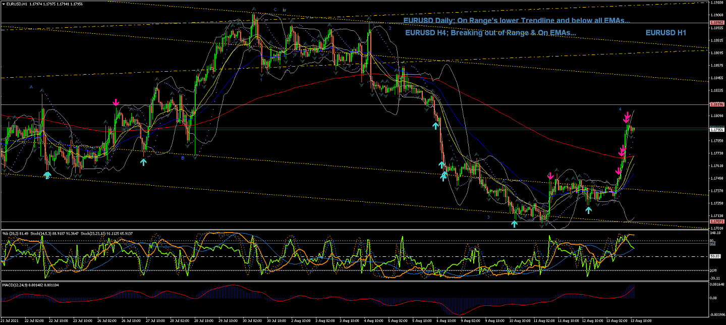 4Hour Chart is showing the price breakout of the Ascending Range (blue) and EMAs to the downside suggests the internal waves of Wave [iii]...