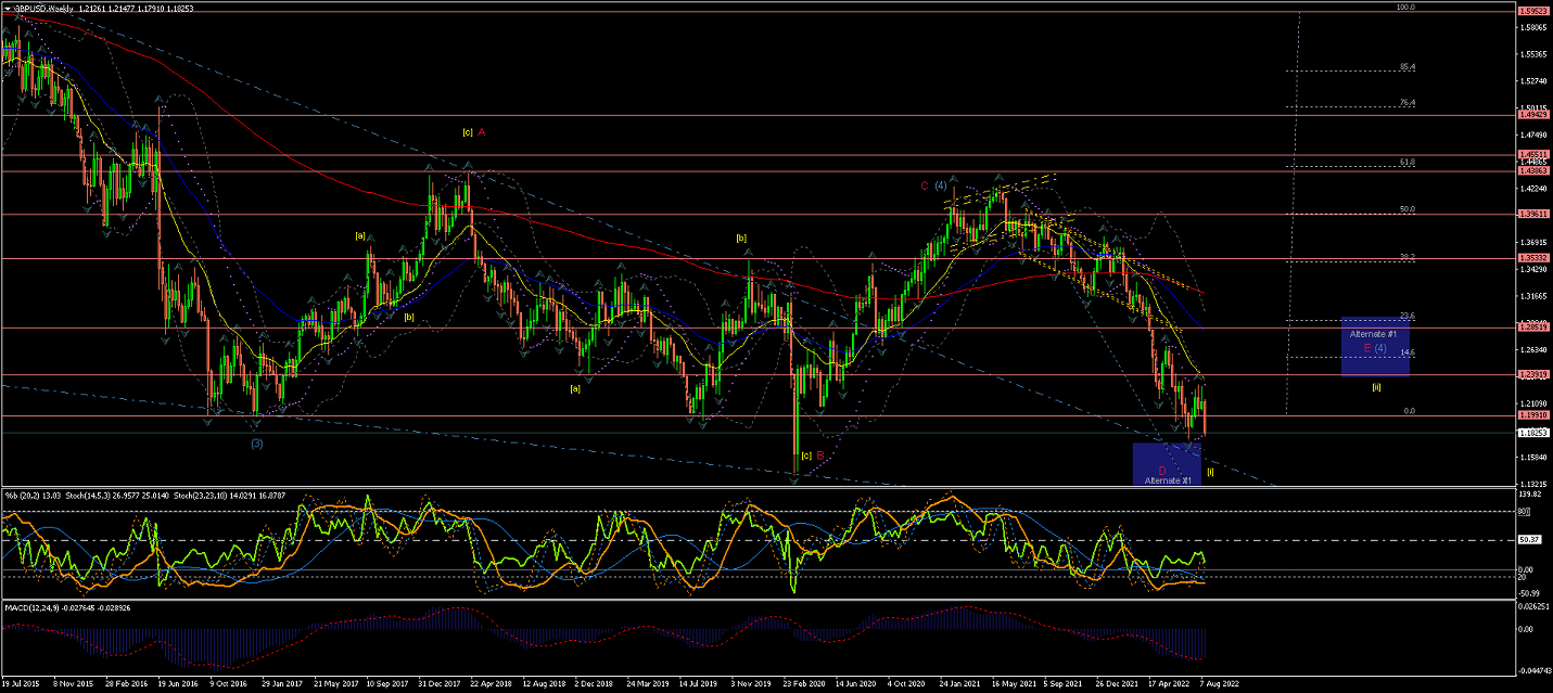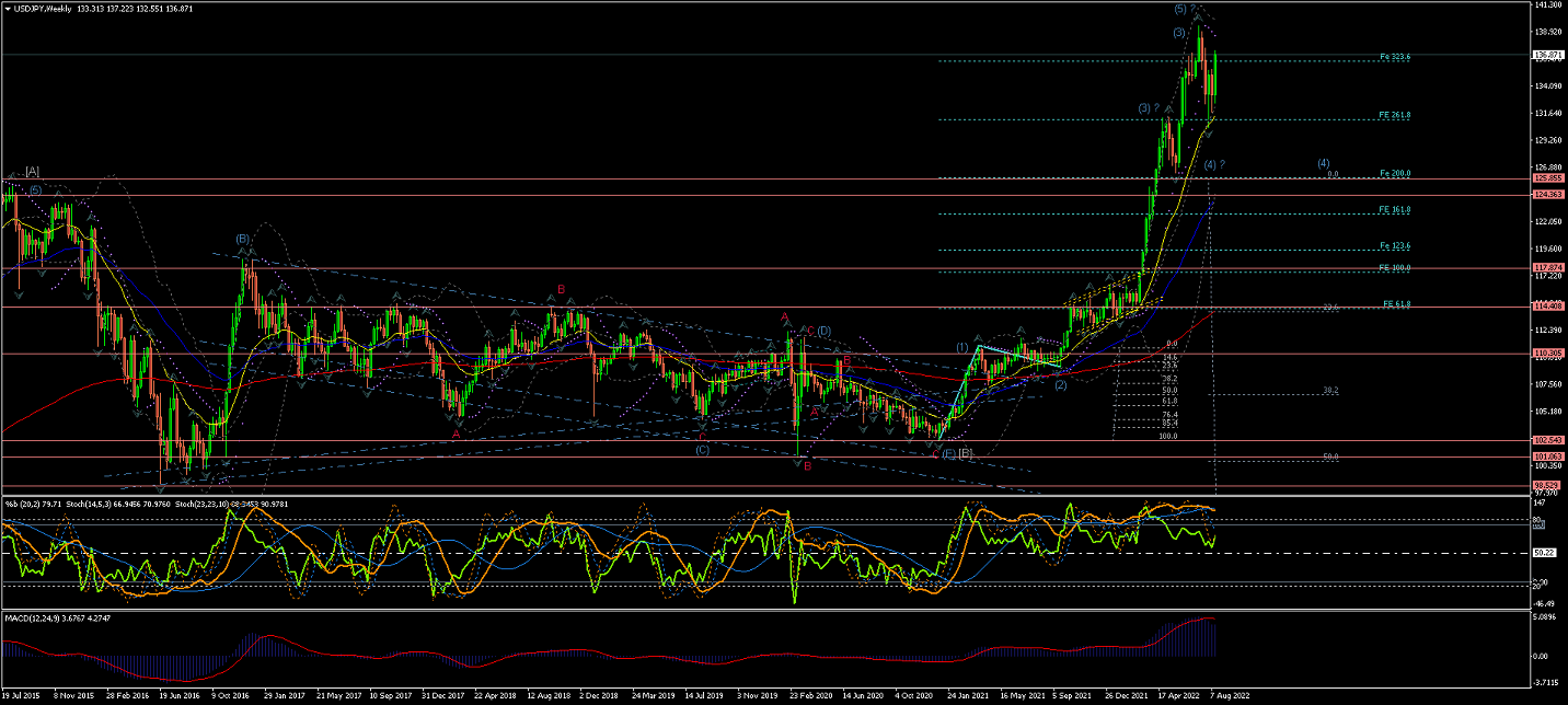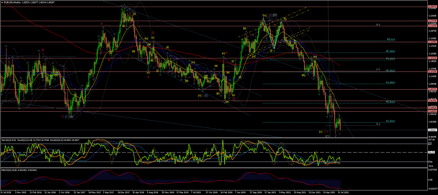 Weekly chart shows an extended Wave (4) correction crossing the EMAs in a rather struggling way...