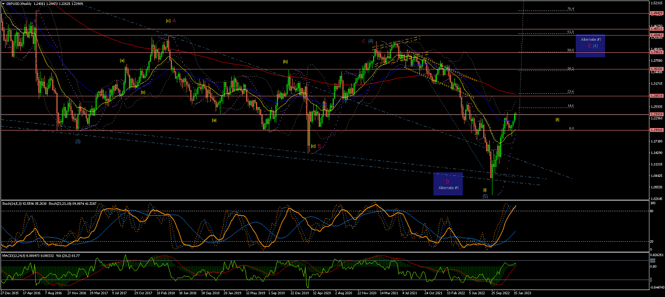 Weekly Chart is showing Wave (1) could be completed now that the price has crossed the upper long-term trendline...