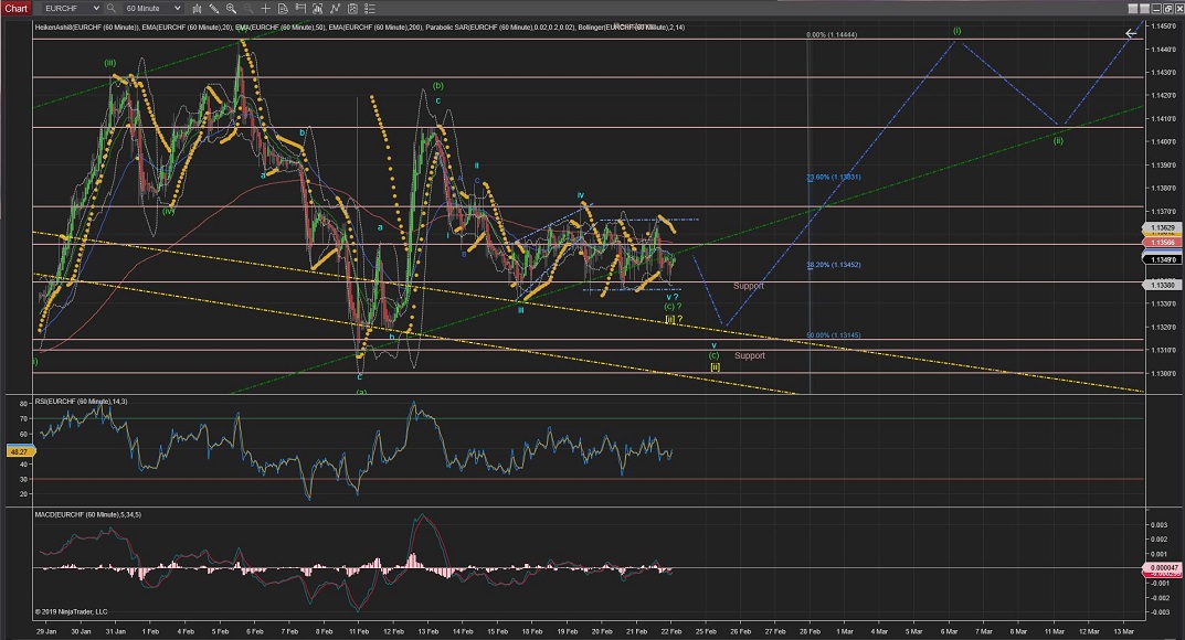 This could mean that a pull out of this trend would make a small move toward the yellow trend to complete Wave v and, with that, Wave (c) and Wave [ii] towards the %50 Fib retracement.