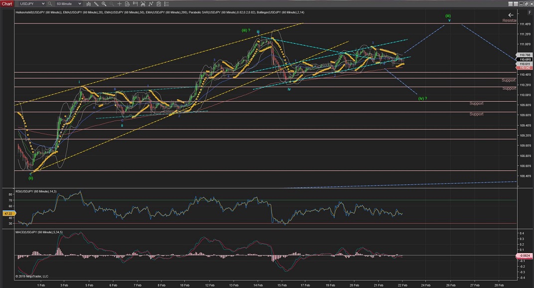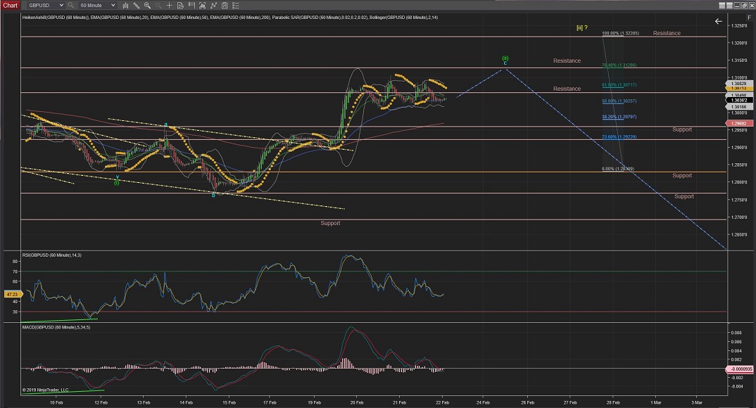 GBPUSD has stalled within resistance levels and the %62 Fib retracement but still showing bullishness, perhaps towards the %76 or, if the price raises more towards the alternate count for a larger Wave [ii] (best seen on the Daily and 4Hour Charts).