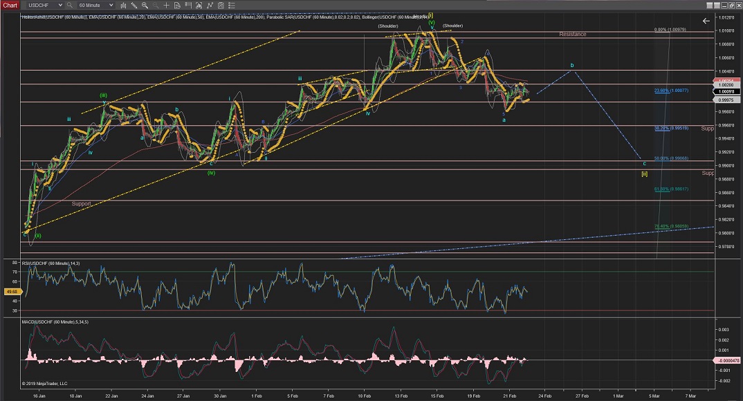USDCHF has made me realise that Wave [i] is now finished with Wave [ii] correction underway now with Wave a completing in 5 waves for Wave a, and currently going through Wave b, suggesting a ZigZag correction (5,3,5) towards lower levels of support.