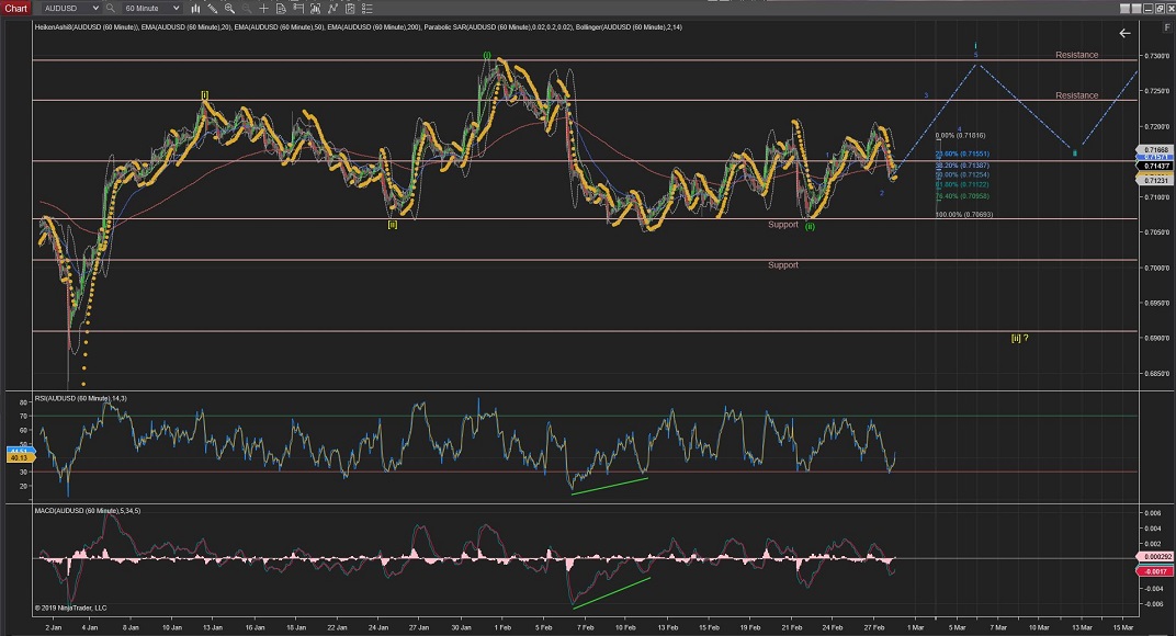 (further moves up from this %76 Fib retracement would suggest a larger Wave (ii) and a break from the 0 Fib retracement would confirm such alternative count).