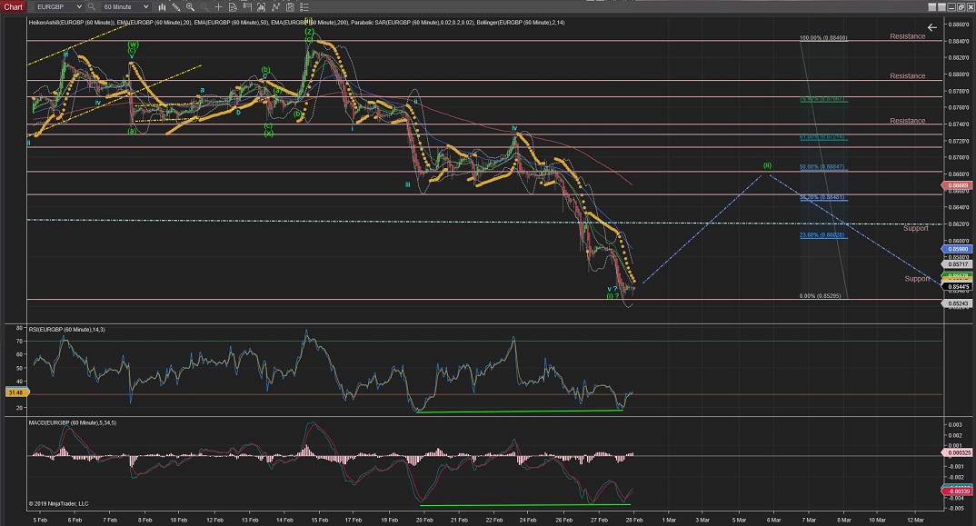EURGBP is still dropped below the lower long-term trendline with an extended Wave v which would have completed Wave (i) and then Wave (ii) correction should start making its way up towards Fib retracement and resistance levels.