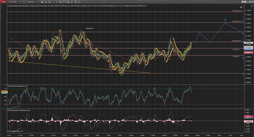 The 60Min chart shows to ha completed a large Wave 2 correction for Wave iii, which suggest that Wave 3 now should continue the impulsive muves higher towards the 0.7200 area if this count is to be valid.