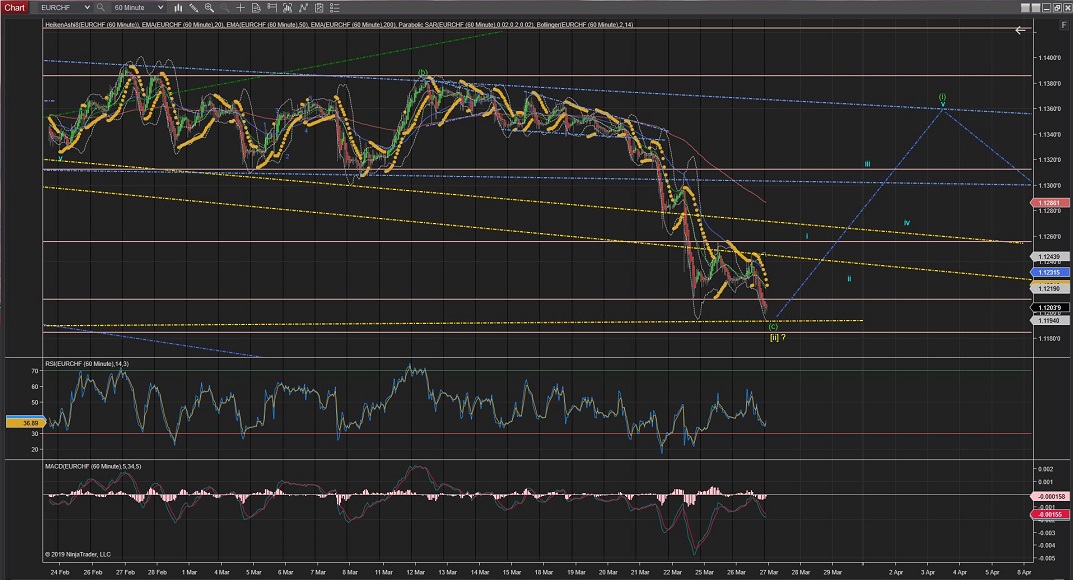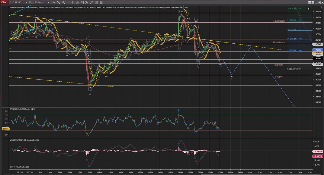 Although most indications are pointing that the price still will be heading down towards the lower long-term trend line again to complete Wave [ii] at the %62 Fib retracement (best shown in the 4Hour Chart).